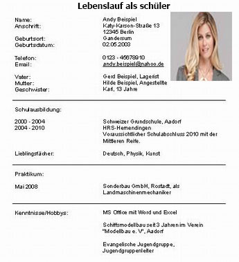 Lebenslauf-Muster: Schüler (Ausbildung, Praktikum ...
