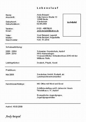 Lebenslauf-Muster: Schüler (Ausbildung, Praktikum ...